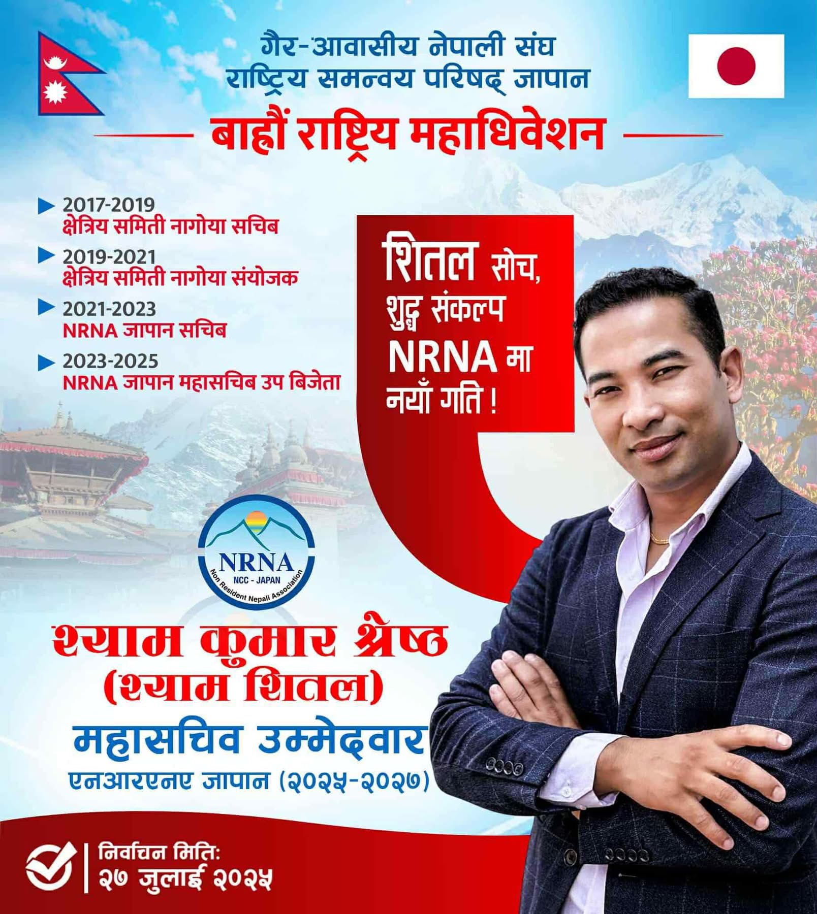 सर्जक एवं सञ्चारकर्ममा समेत लागेका श्यामकुमार श्रेष्ठ (शितल)NRNA जापानको महासचिवमा उमेदवारी घोषणा संगै प्रचार – प्रसारमा लागेका छन्। मिठो स्वरका धनि उनि गित संगितमा समेत कृयाशिल छन्। उनका शिरमा सिरफुल सजाउने मायालाई लगाएतको गितहरु अहिले पनि चर्चित छन्। नेपाल रहदा रेडियो कर्ममा समेत लागेका उनि मिडिया सेन्टर जापानका उपाध्यक्ष एवं नेपाल पत्रकार महासंघ जापान साखाका सदस्य समेत हुन्।गैरआवासीय नेपाली संघ जापान NRNAको आगामी कार्यकाल (सन २०२५-२७)का लागि निवर्तमान कार्यसमितिका सचिव श्याम शितल(श्याम कुमार श्रेष्ठ)ले महासचिव पदमा उम्मेदारी घोषणा गरेका छन्। उनले यस अघि महासचिवमा हार व्यहोरेका थिए। शितलले भने सेवा हाम्रो साथ तपाईंको यो अन्तिम परिक्षा पास गराउने जिम्मा हजुरको ! उनि बिभिन्न संघ संस्था हुँदै गैरआवासीय नेपाली संघ जापानमा सन २०१७-२०१९ नागोया क्षेत्रिय समिती सचिव,सन २०१९-२०२१ नागोया क्षेत्रिय समिती संयोजक र सन २०२१-२०२३ कार्यकालमा गैरआवासीय नेपाली संघ जापानको सचिव पदमा क्रियाशिल रहेका थिए।