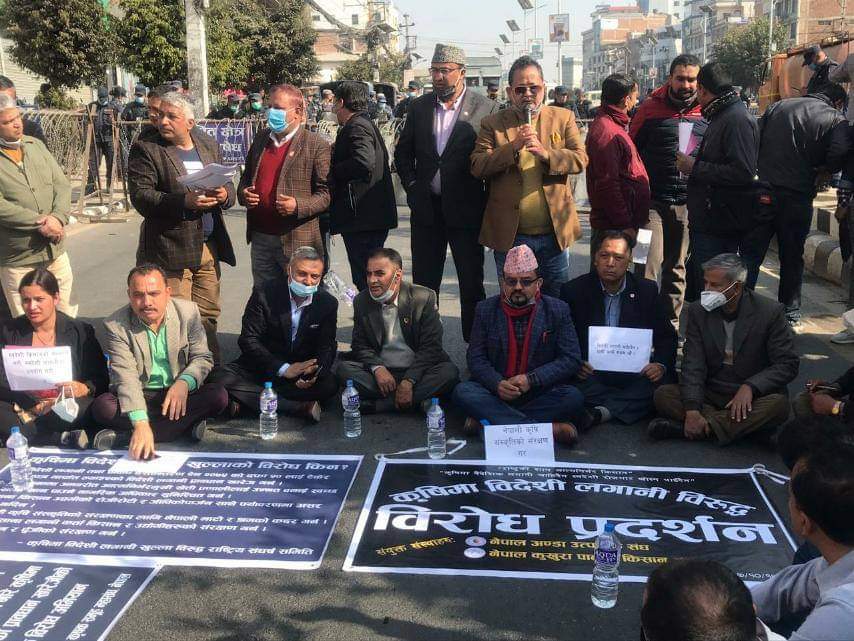 काठमाडाँै, १४ माघ । कृषिमा विदेशी लगानीको विरोध गर्दै यसको संघर्ष समितिले आज बानेश्वर सडकमा विरोध प्रदर्शन गरेको छ । प्रदर्शनमा उल्लेखित सबै संघ, एसोसिएसन, संगठन र महासंघको एक्वेवद्धता जनाएका थियो । प्रदर्शनमा ४० वटा भन्दा बढि संघहरुबाट प्रतिनिधि भेला भई आ–आफ्नो विचार राख्नु भएको थियो । संघर्ष समितिका महासचिव प्रल्हाद दाहालले संचालन गर्नु भएको सभामा संयोजक शिवराम के.सिले विदेशी लगानी आउनु भनेको देशको दुर्भाग्य हो देशको अर्थतन्त्र खस्किनेका साथै स्वरोजगार भएका किसानहरु, उद्योगी व्यवसायीहरुको समेत रोजीरोटी खोसिने कुरा उल्लेख गर्नुभयो । सबै एसोसिएसन तथा संघ महासंघका प्रतिनिधिहरुको एउटै आवाज थियो कि नेपालमा विदेशी लगानी भित्रिंदा समग्र किसान, उद्योगी व्यवसायी र अन्य धेरै क्षेत्रमा असर पर्ने, स्वदेशी उत्पादन प्रयोग नहुने, देशको अर्थ व्यवस्था धारासायी हुने, स्वरोजगार किसानहरु बेरोजगार हुने तथा अन्य धेरै कुराहरु उल्लेख गरिएको छ ।