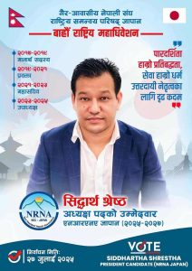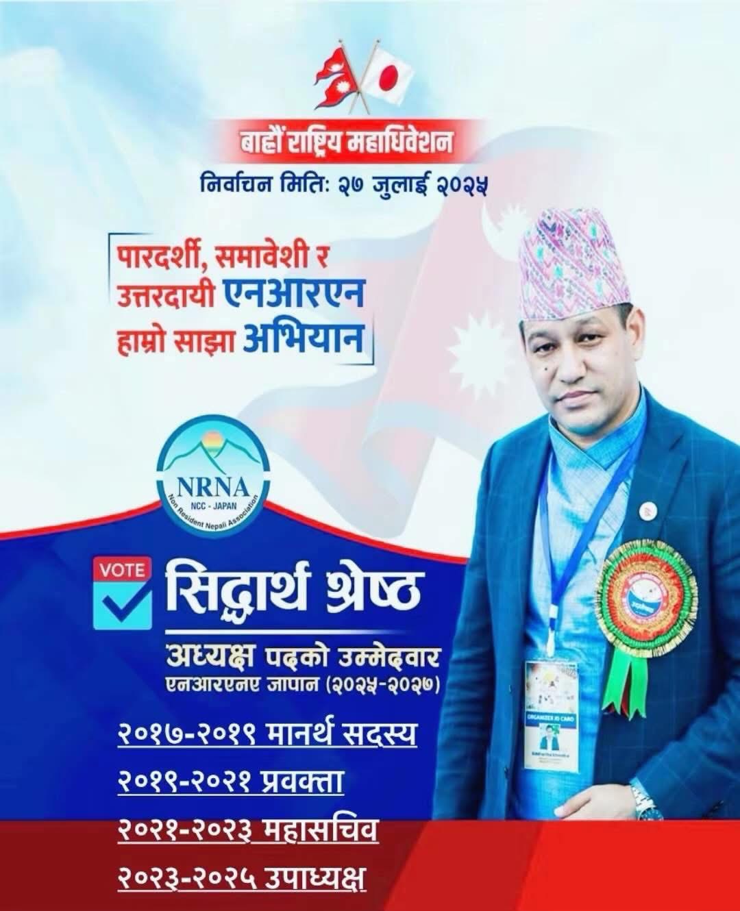 हाकी, निडर र कर्मशील स्वभावका सिद्धार्थ श्रेष्ठको उम्मेदवारीले एनआरएनए जापानको निर्वाचनलाई थप रोचक बनाएको छ। जुलाई २७ तारिखमा हुने चुनावमा श्रेष्ठको उम्मेदवारी सशक्त प्रतिस्पर्धाको संकेत मानिएको छ।